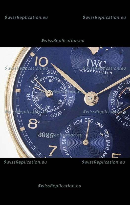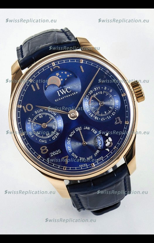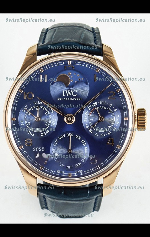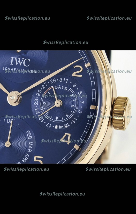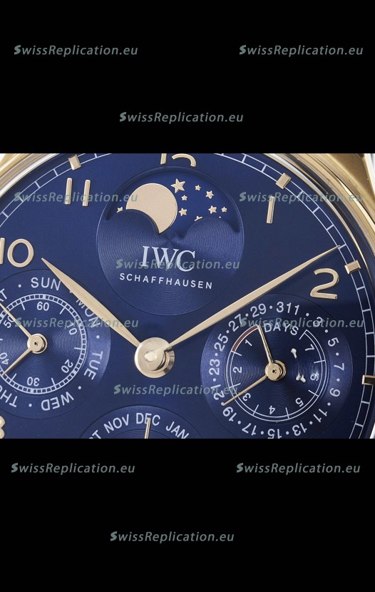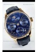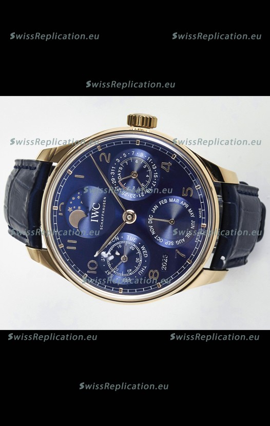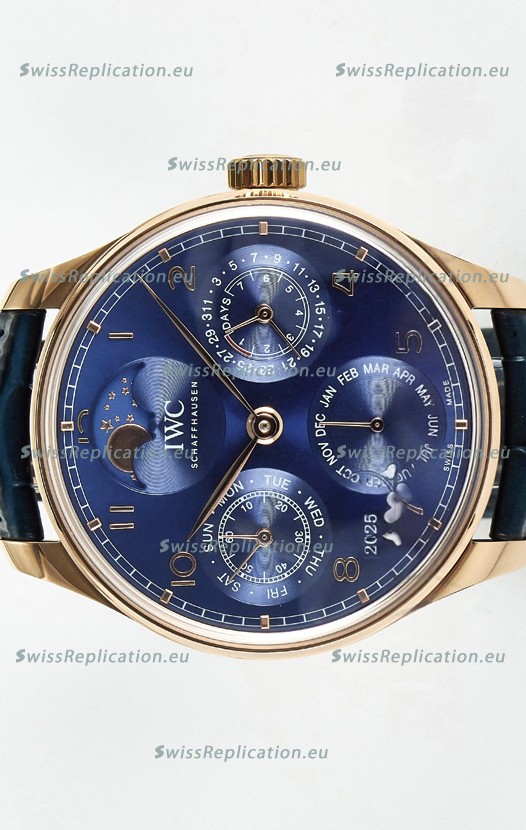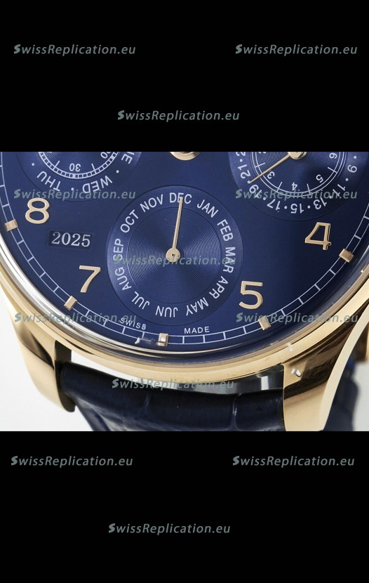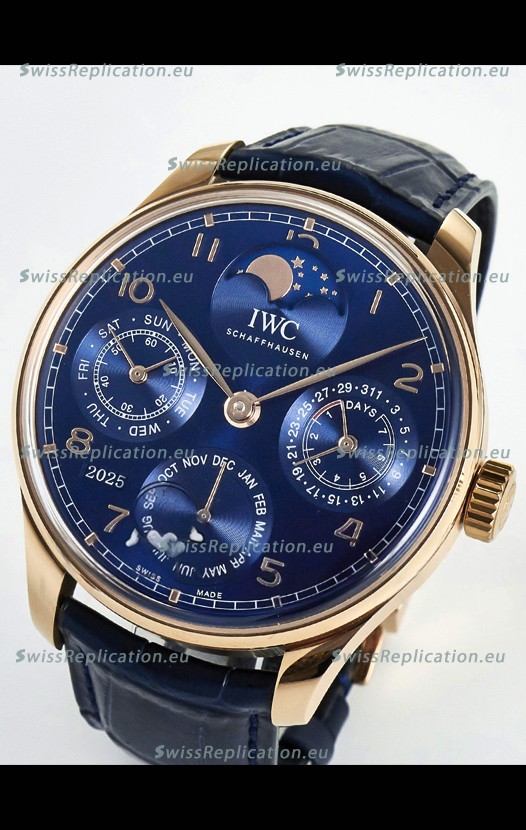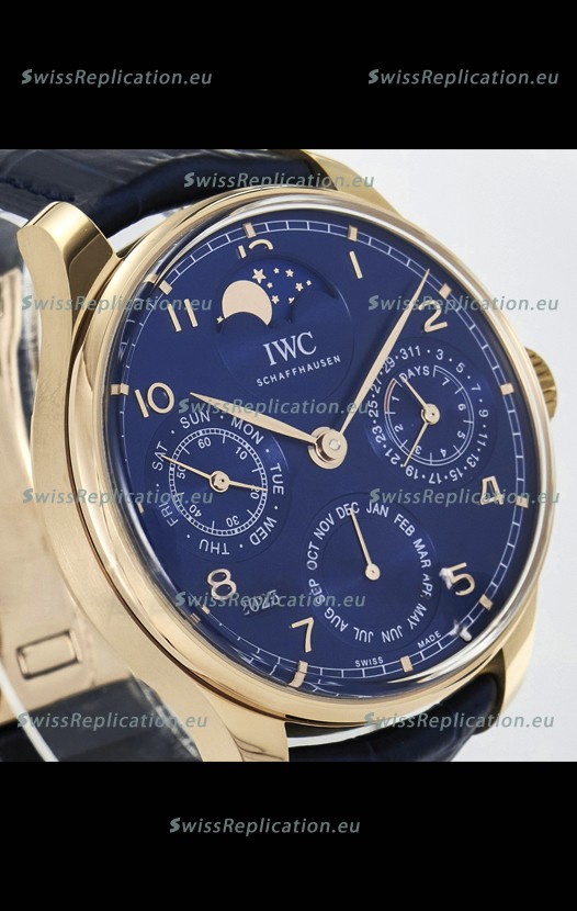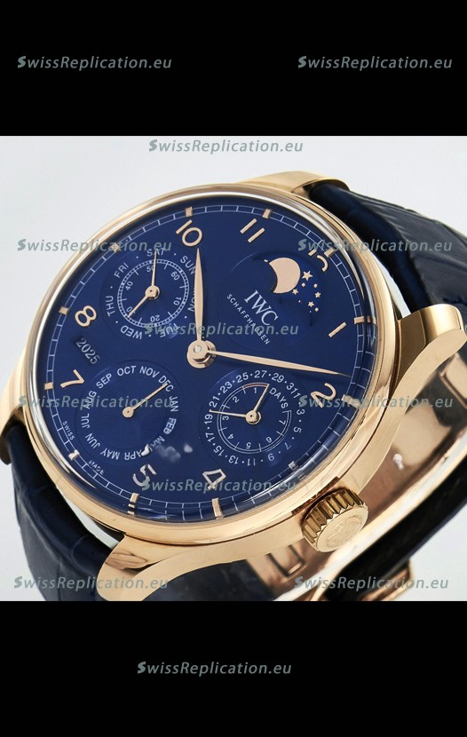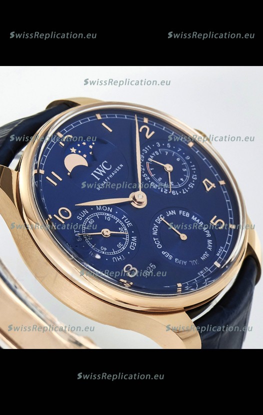 | Description | IWC Super Clone Portuguese Perpetual Calendar Rose Gold Blue Dial Replica Watch |