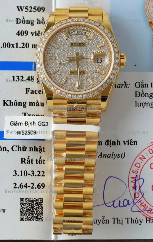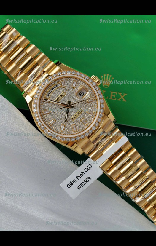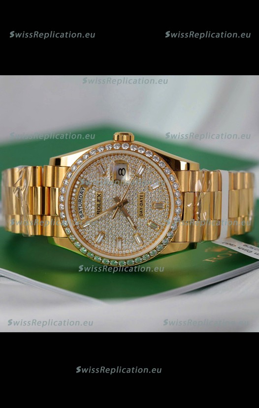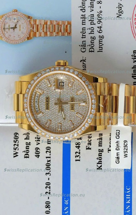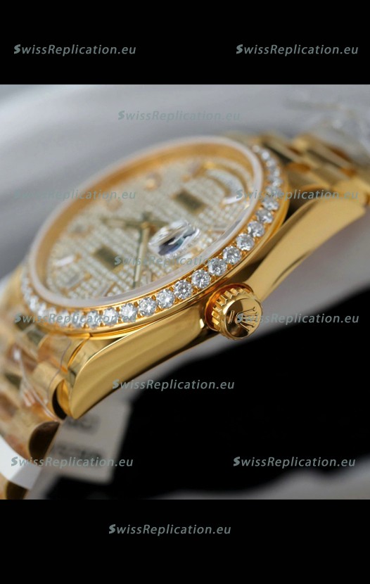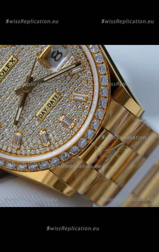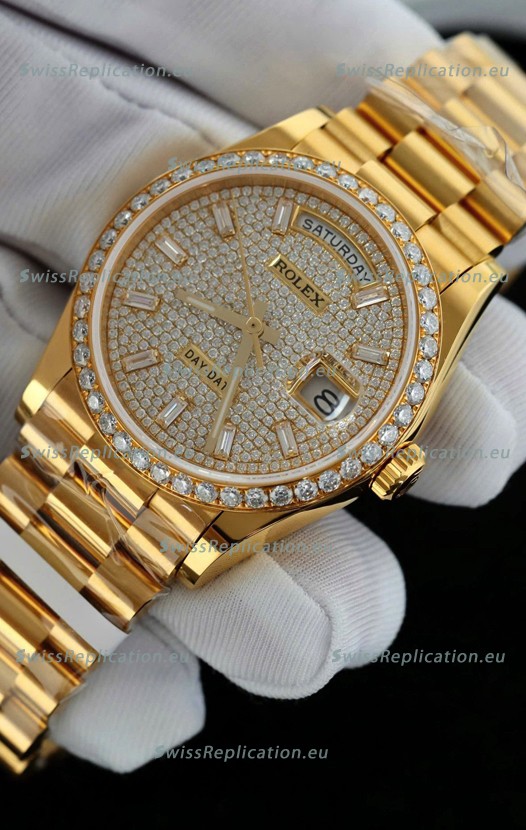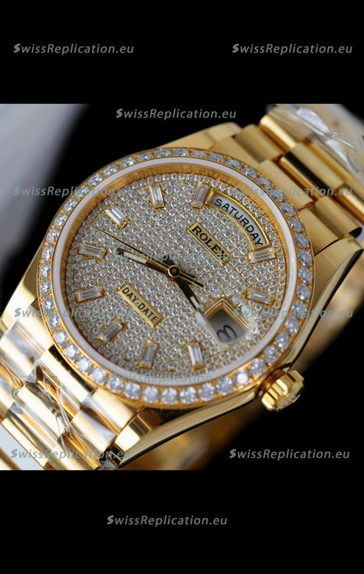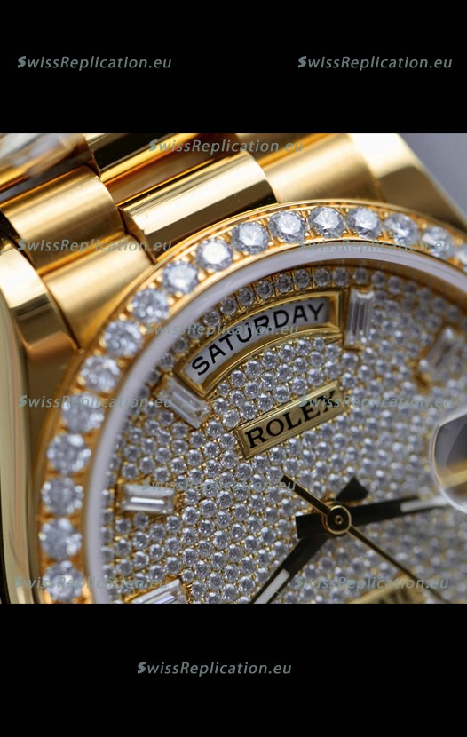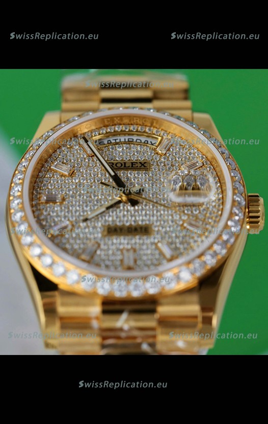 | Description | Rolex Day Date Super Clone Yelllow Gold Plated Custom Modified Diamonds Paved Watch |